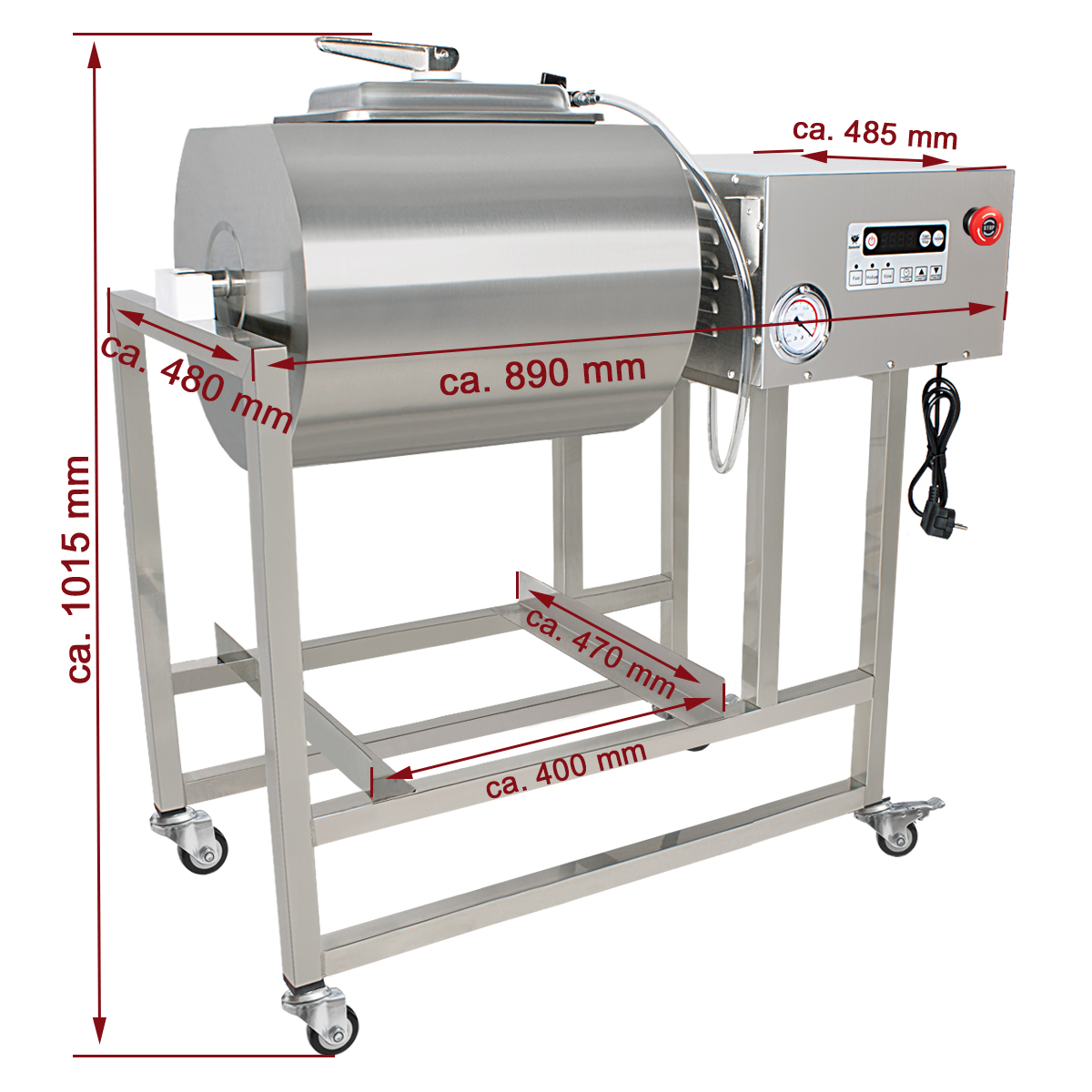 An dem Tumbler können die Vakuumzeit sowie die Zeit für den Mischvorgang individuell digital eingestellt werden. Zudem können Sie zwischen verschiedenen Umdrehungen der Trommel wählen.