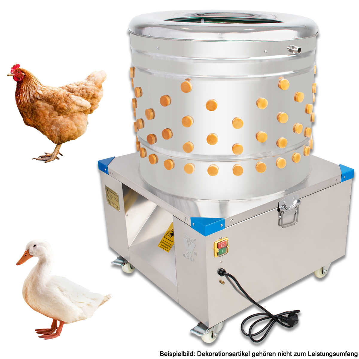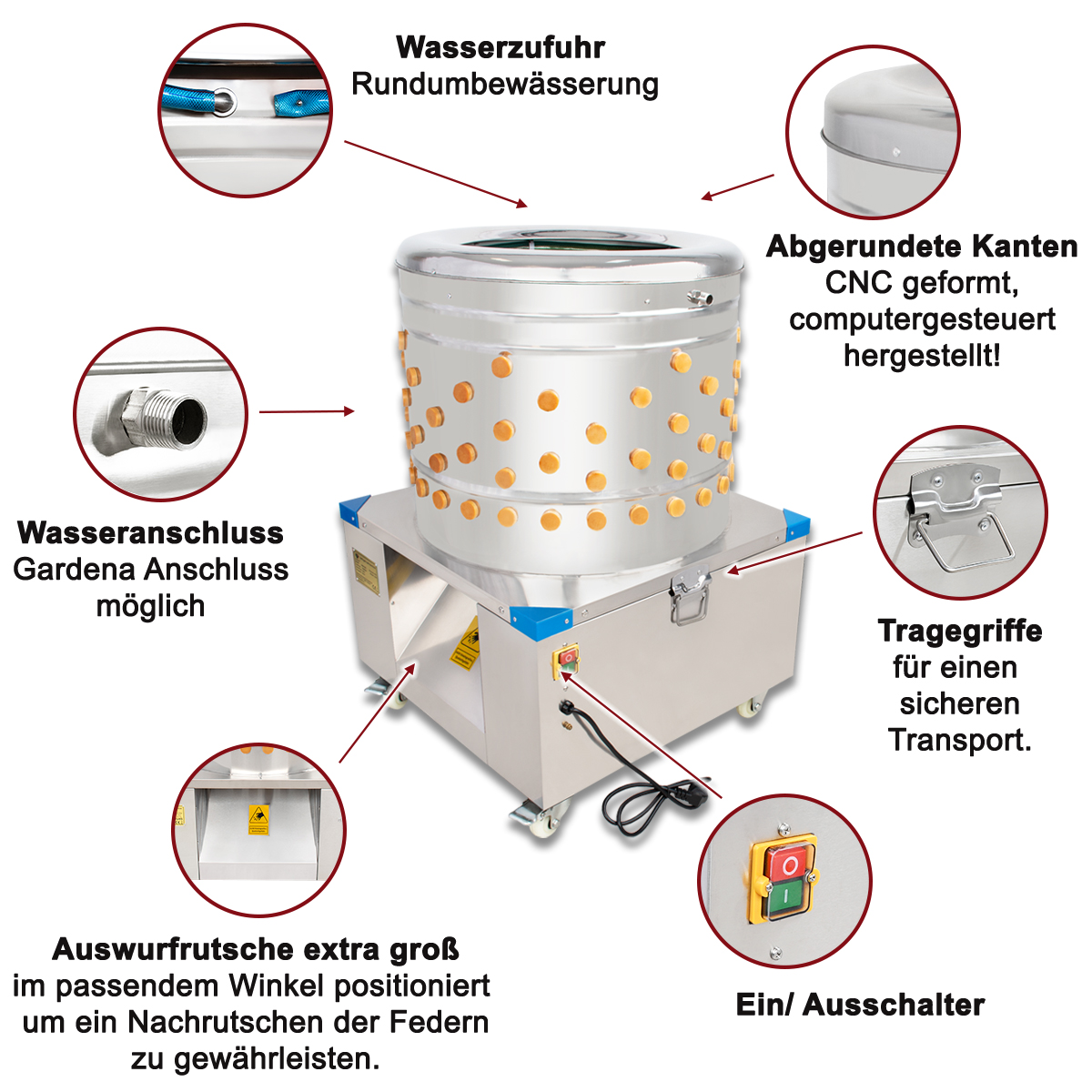 Bitte beachten Sie auch die Größen/Maße der Maschine, bevor Sie eine zu kleine Maschine kaufen. Große Gänse und Puten benötigen einen bestimmten Platz, um auch realistisch in der Maschine rotieren zu können und ein Rupfen aller Federn ohne Schlachtschäden gegeben ist.