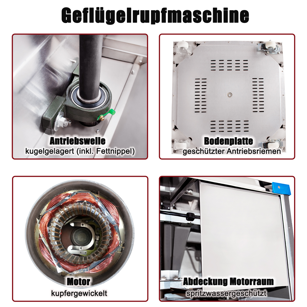 Durch eine sehr gute Verarbeitungsqualität, spezielle Rupffinger und der Konstruktion mit integrierter Spülung ist gewährleistet, dass die Geflügelrupfmaschine wirklich nur die Federn rupft. Verletzungen des Geflügels werden damit weitgehend vermieden und eine hohe Qualität beim Rupfen des Geflügels erzielt.