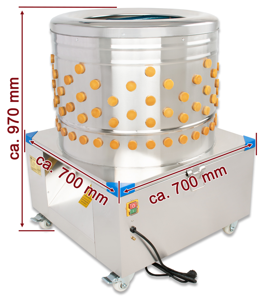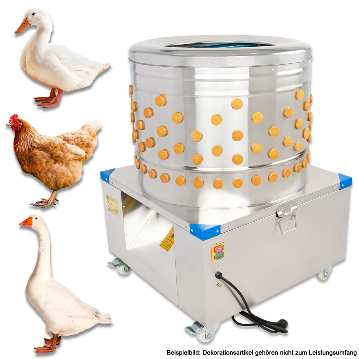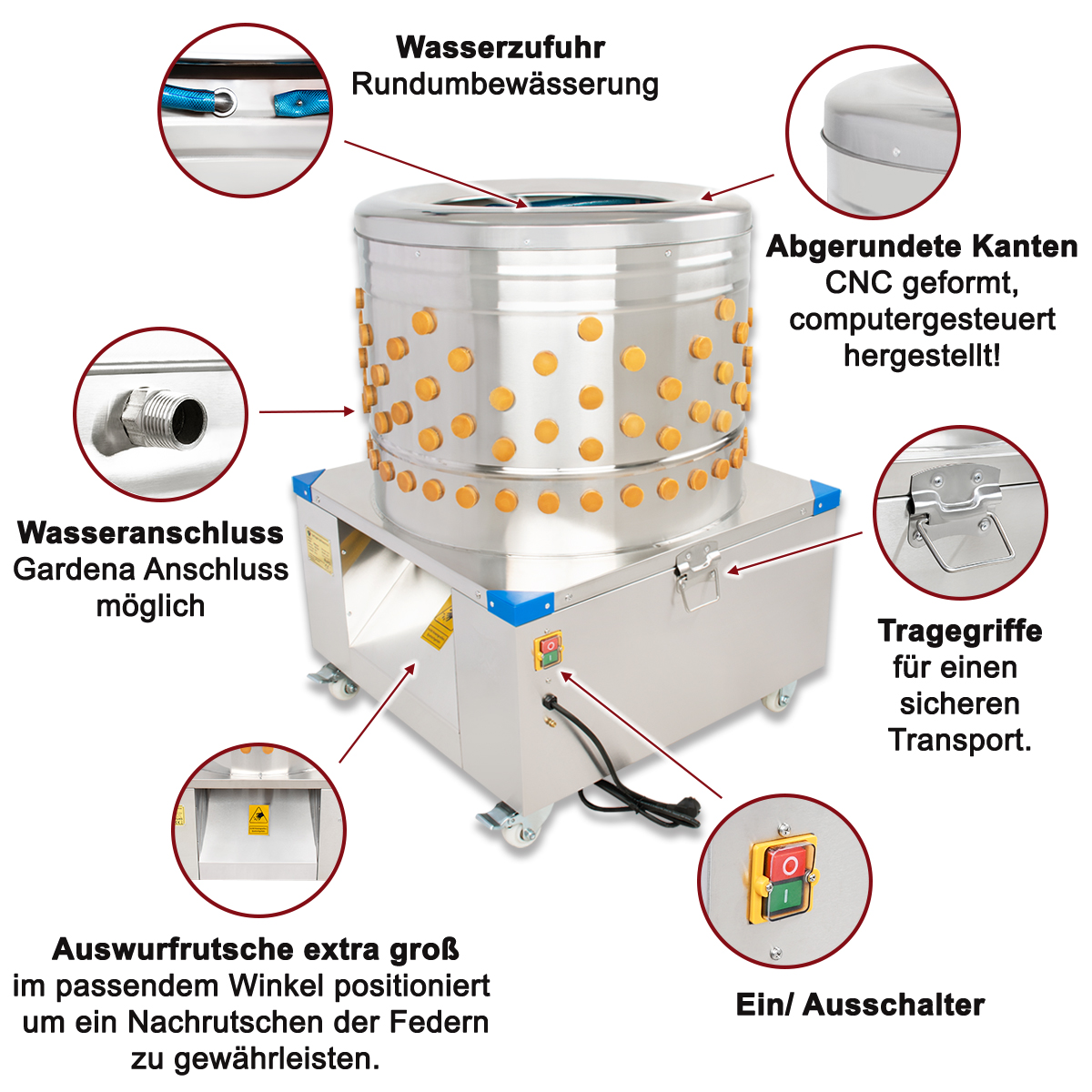 Bitte beachten Sie auch die Größen/Maße der Maschine, bevor Sie eine zu kleine Maschine kaufen. Große Gänse und Puten benötigen einen bestimmten Platz, um auch realistisch in der Maschine rotieren zu können und ein Rupfen aller Federn ohne Schlachtschäden gegeben ist.