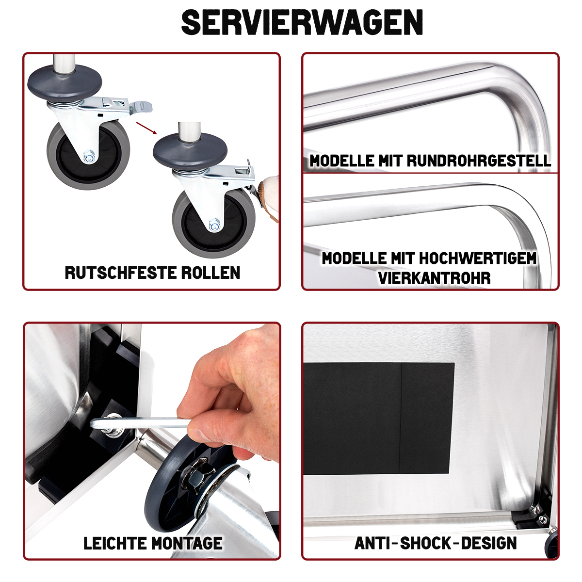Die Servierwagen der BSW-Serie sind mit einem Rundrohrgestell ausgestattet