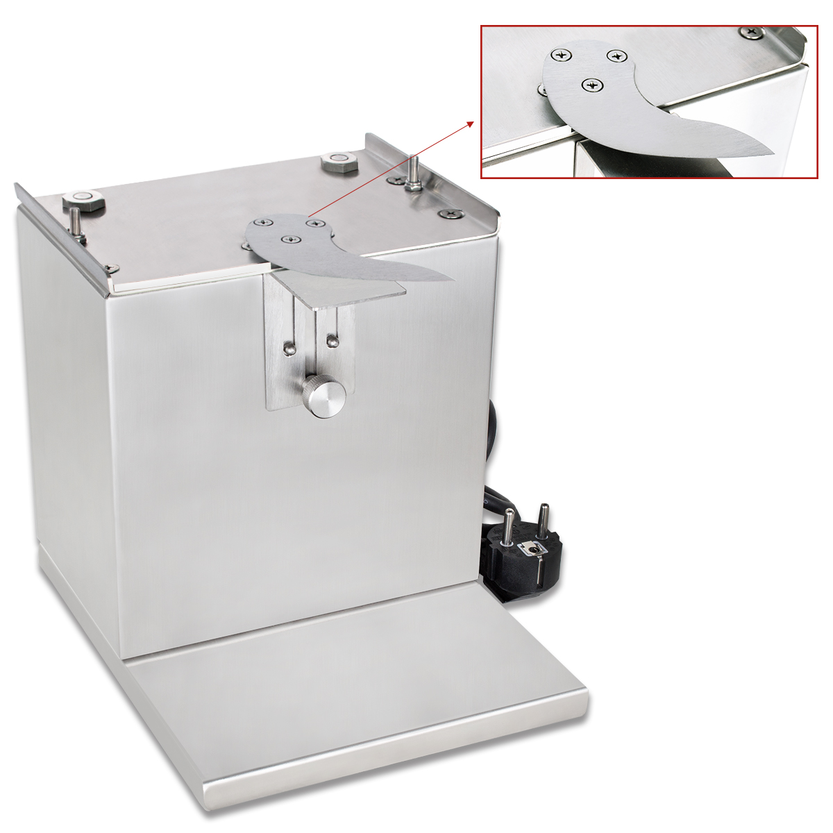Das zeitlose Design des Currywurstschneiders passt sich jedem Ambiente an. Das Gehäuse sowie die Messer sind aus hochwertigem Edelstahl gefertigt.